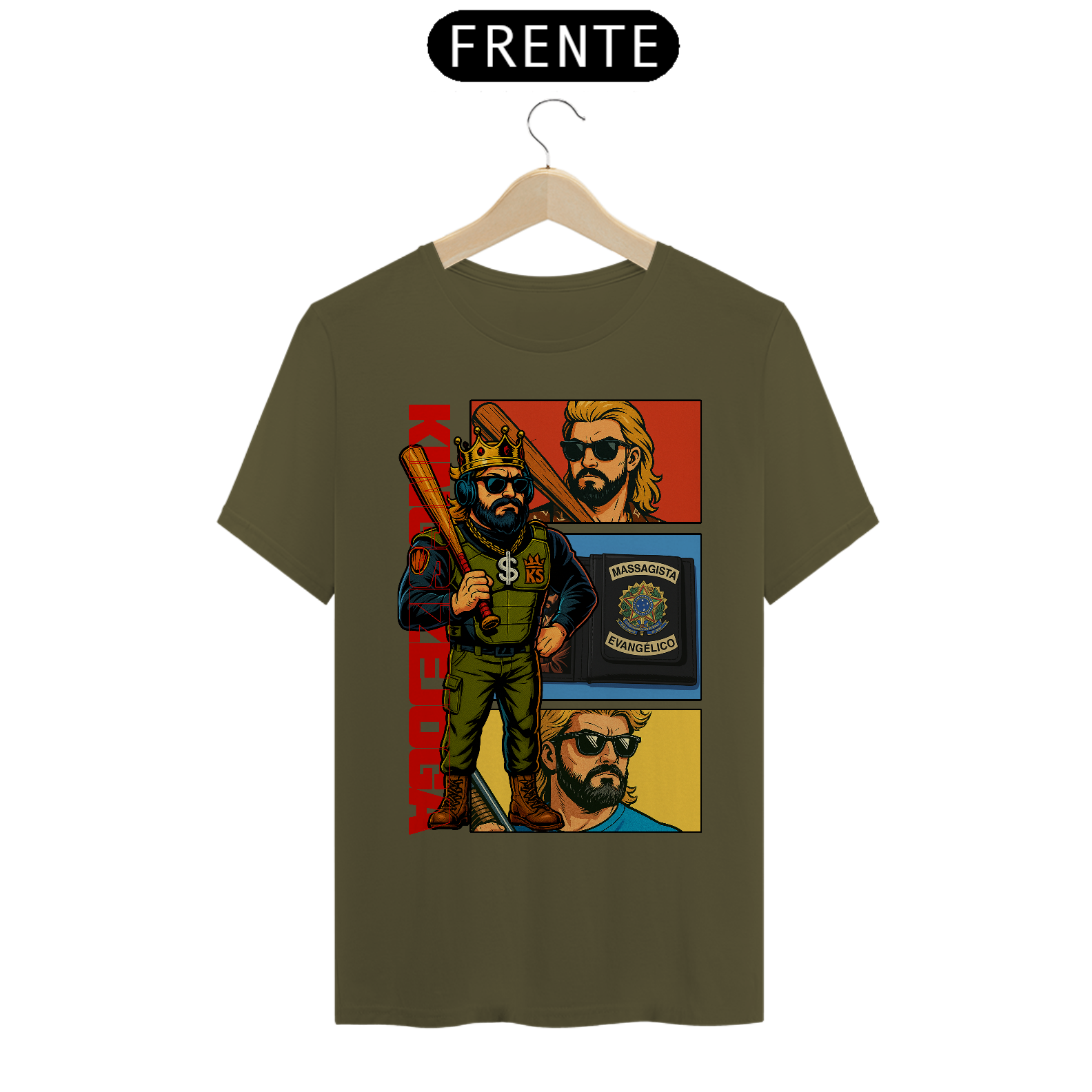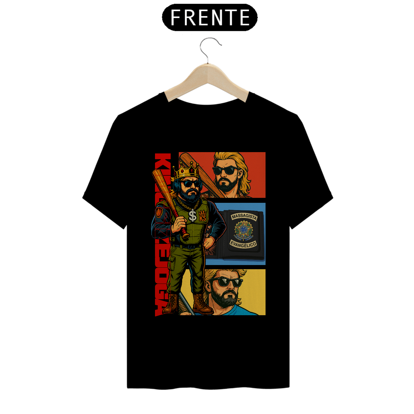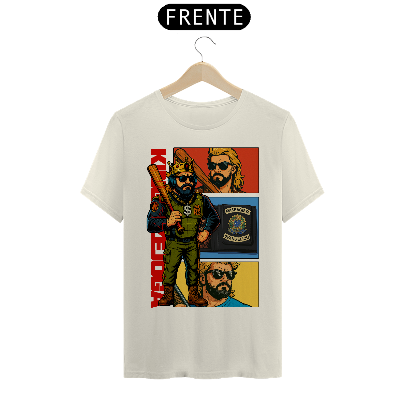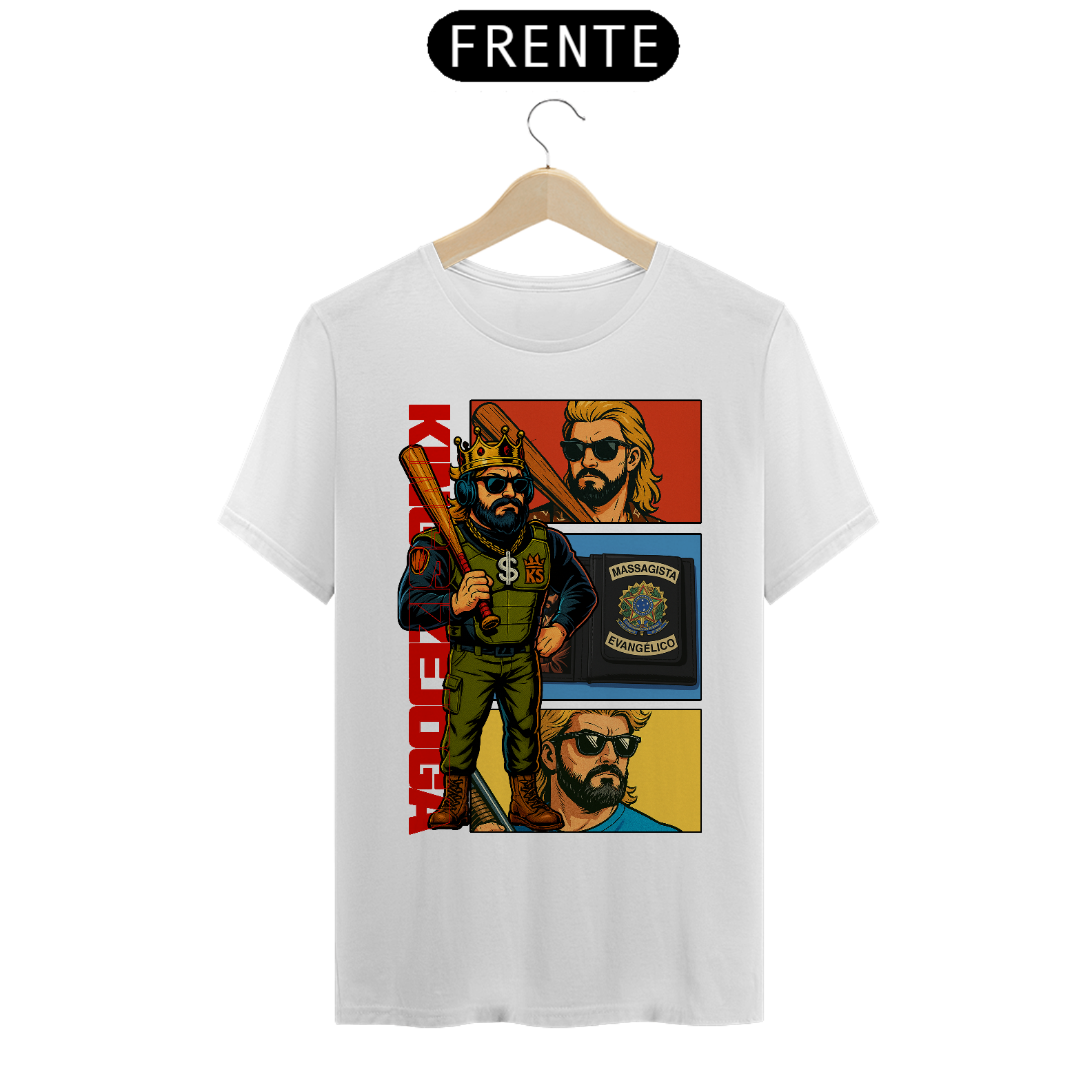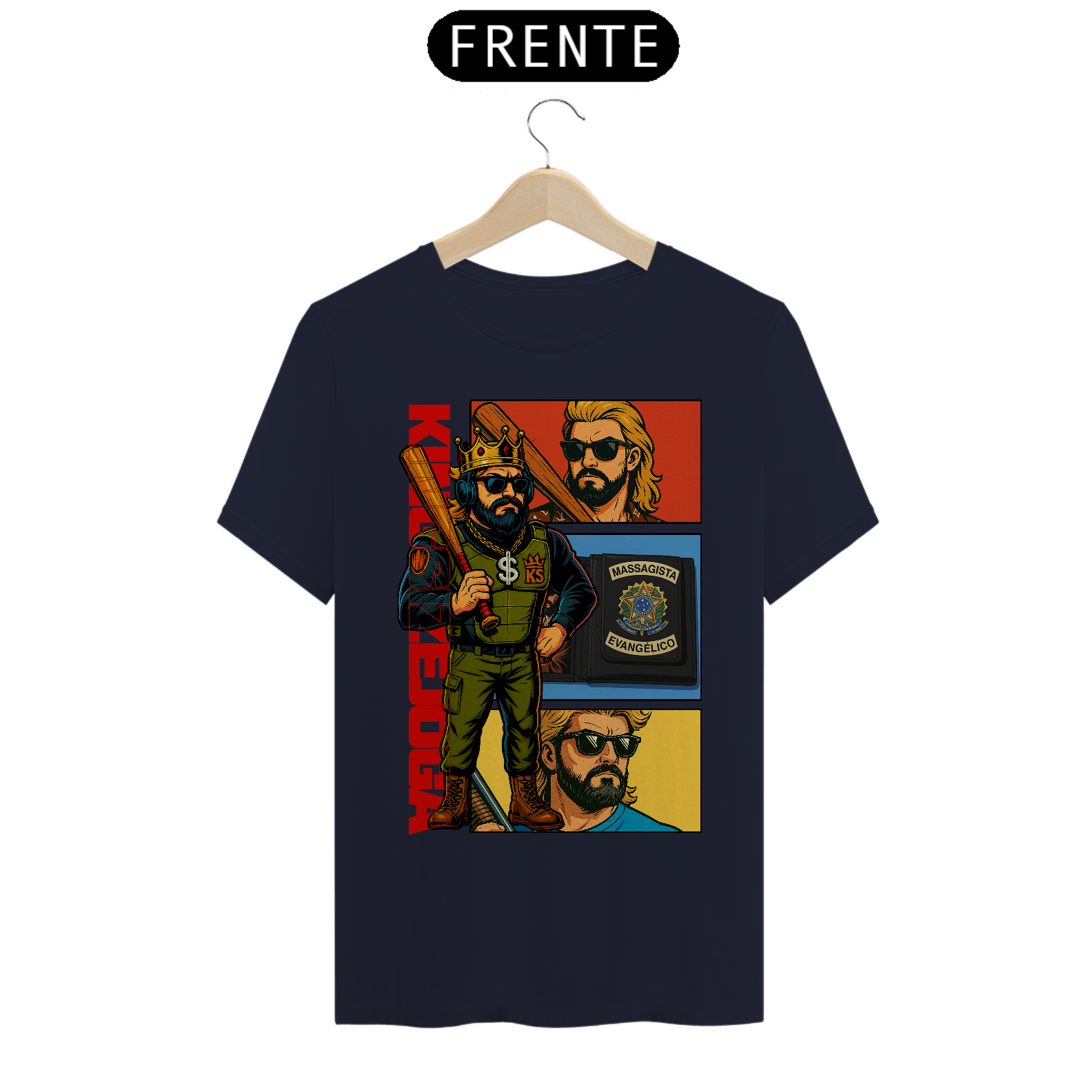A saga começa aqui! A camisa “KNLHA Comics” é uma edição limitada com arte exclusiva no estilo quadrinhos, trazendo o Rei em sua forma mais lendária: coroa na cabeça, taco na mão e a carteira de massagista evangélico no bolso. Ideal pra quem vive no modo história o tempo todo. Veste a zoeira, coleciona estilo.
